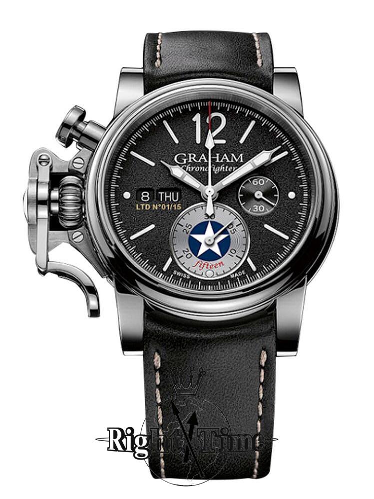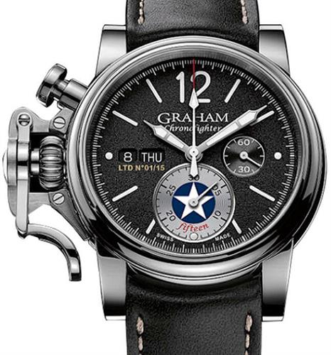 Graham Chronofighter Vintage US Army Limited Edition of 15 pieces. Model 2CVAS.B04A.L12. Swiss automatic chronograph movement. Stainless steel case with left hand fast-action start/stop trigger and reset pusher. Sapphire crystal. Black textured dial with US Army Star on a 30-minutes sub-dial, day/date calendar. 100 meters water resistant. Black leather strap