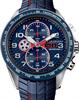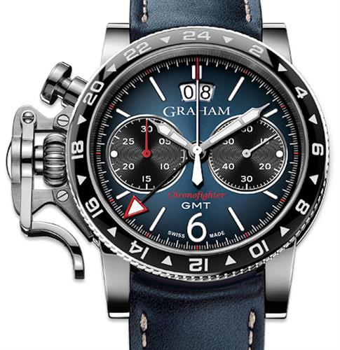 Graham Chronofighter Vintage GMT. Model 2CVBC.U02A. Swiss automatic chronograph movement with Big-Date calendar. Stainless steel case with left hand fast-action start/stop trigger and reset pusher. Sapphire crystal. Blue textured dial with black sub-dials, second time-zone hand, and date calendar at 12 o`clock. 100 meters water resistant. Blue leather strap