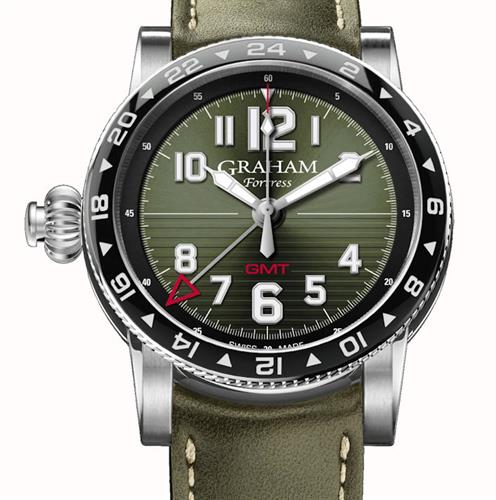 Graham Fortress GMT Green model 2FOBC.G01A. Swiss automatic chronograph movement. Stainless steel case with mono-pusher crown set. Sapphire domed crystal. Green dial with second time zone indicator, luminous Arabic numerals and hands. 100 meters water resistant. Green leather strap