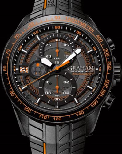Graham Silverstone RS Endurance model 2STCB.B04A. Swiss automatic chronograph movement. Stainless steel black PVD plated case with black ceramic bezel and orange tachymeter scale. Sapphire crystal. Black-smoked openwork dial, black/orange minute scale. 100 meters water resistant. Black "Tire" style rubber band with orange accents.