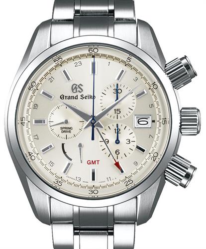 Grand Seiko Spring Drive GMT chronograph watch model SBGC201G. White dial with power reserve hand, second time zone pointer, date calendar, yellow color hands and markers. Stainless steel case and bracelet. 100 meters water resistant