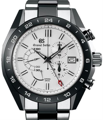 Grand Seiko Titanium/Ceramic Spring Drive chronograph watch model SBGC221G. White dial with power reserve hand, second-time zone hand, and date calendar.