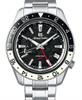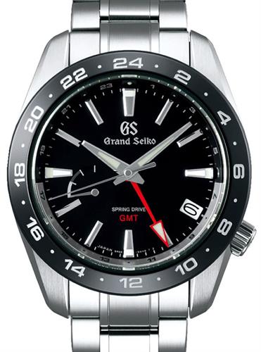 Grand Seiko model SBGE253. Grand Seiko 9R66 Spring Drive movement with GMT(second time zone), power reserve, and date indicators. Stainless steel case and bracelet with black ceramic rotating 24 hour bezel. Black dial with steel tone hands and markers, filled with LumiBrite for nighttime visibility. Diver rated to 200 meters.