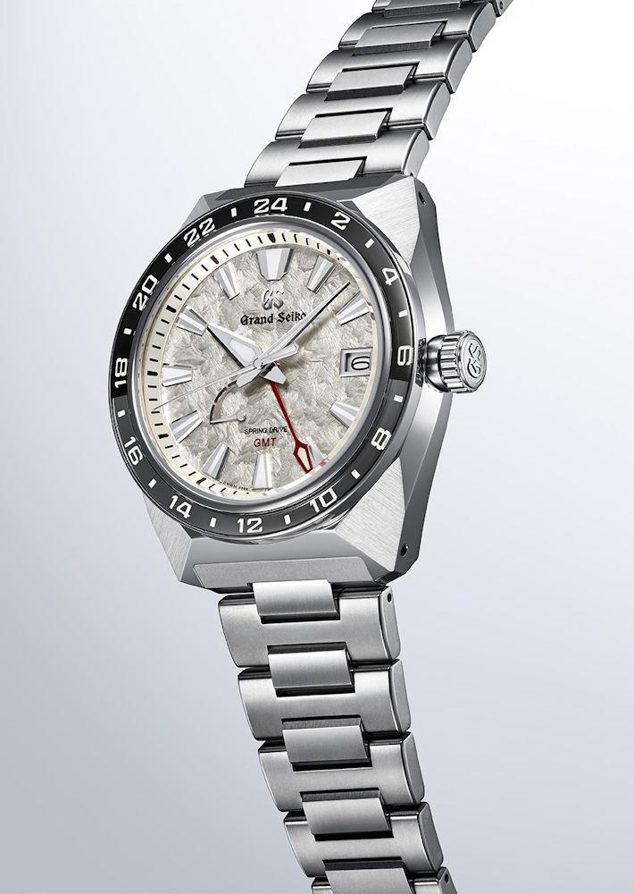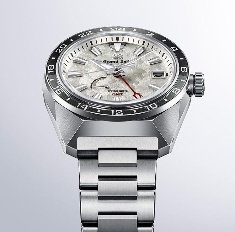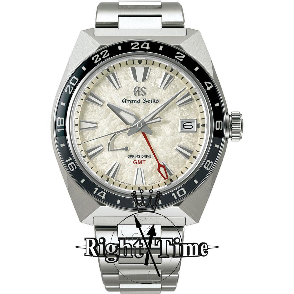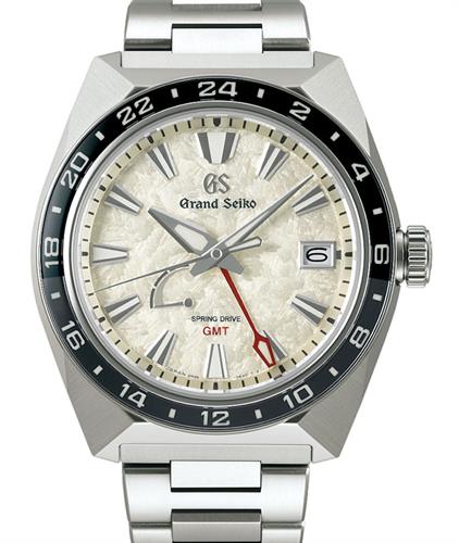 Grand Seiko GMT Spring Drive model SBGE307. Stainless steel case and bracelet. Dual-curved sapphire crystal. Shining white dial texture evokes a lion`s mane glimmering in the rays of the sun. Watch is powered by an automatic Spring Drive movement Caliber 9R66.