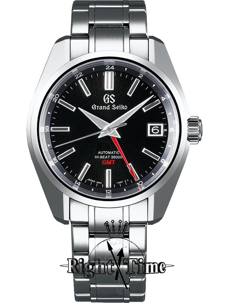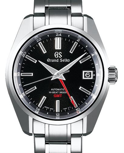 Grand Seiko model SBGJ203G. Seiko Hi-Beat 36,000 Automatic movement with GMT function. Textured black dial. Stainless steel case and bracelet. Sapphire crystal on both top and observation back.