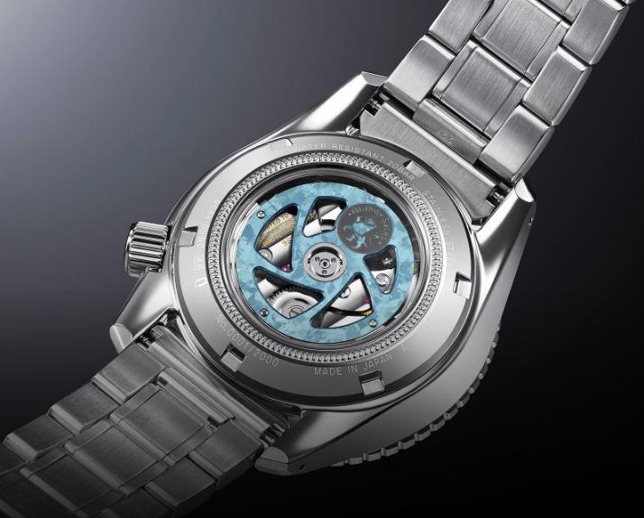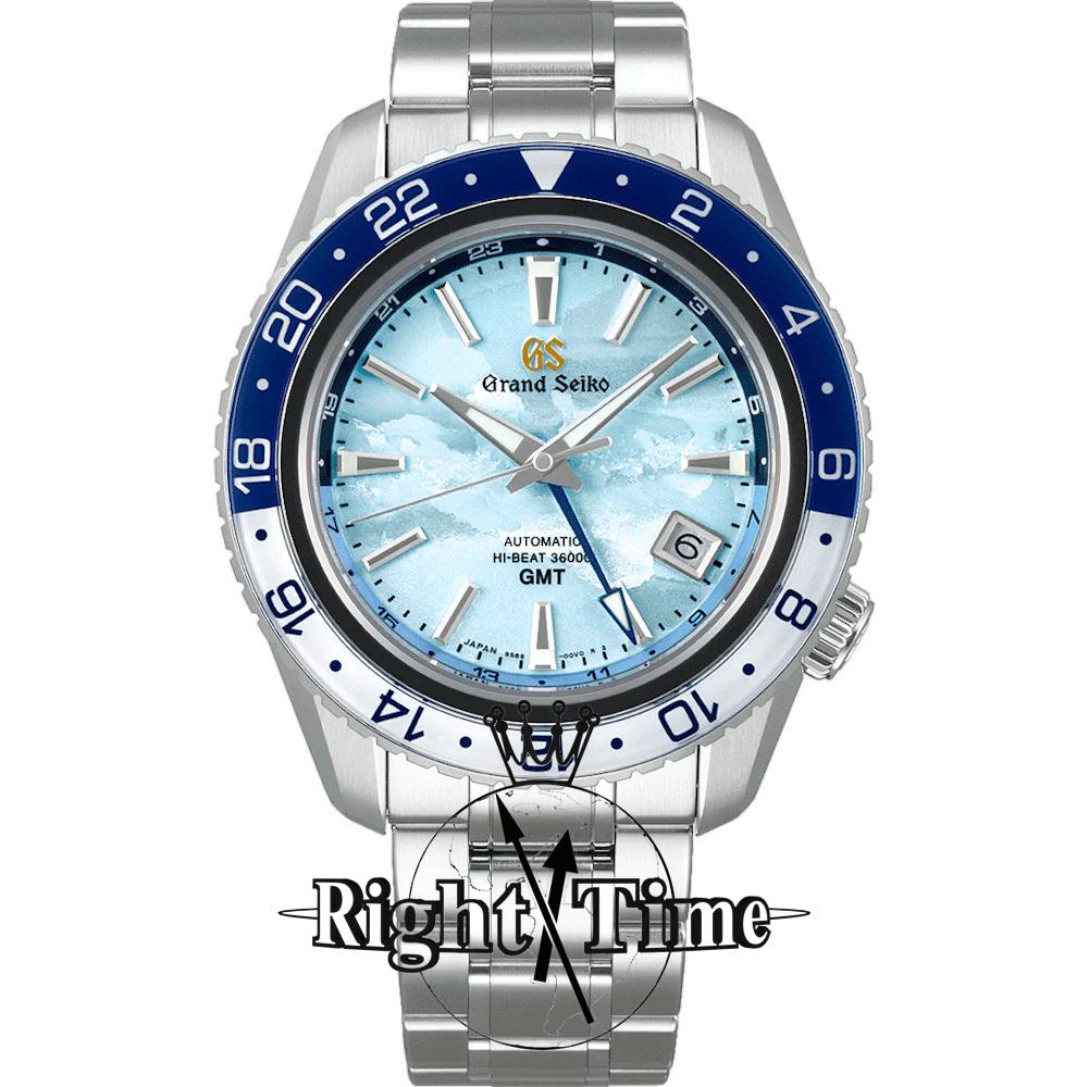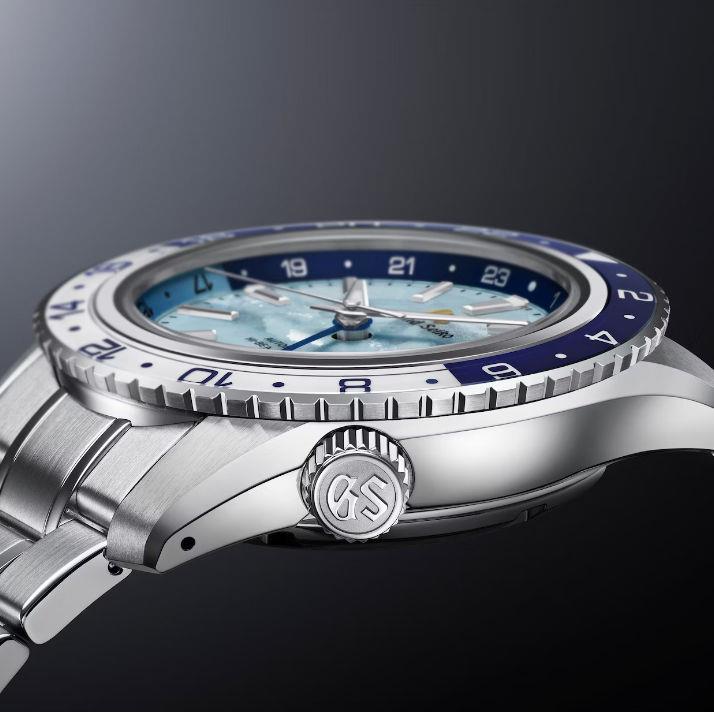 Grand Seiko Mechanical Hi-Beat 36000 GMT model SBGJ275. Blue dial illustrates a rare daybreak scene, when humid air forms dense clouds that overlay and appear to be a sea of clouds. The blue color is inspired by the color of the sky over Mt. Iwate, the peak visible from the Grand Seiko Studio Shizukuishi. Powered by Hi-Beat Caliber 9S86.
