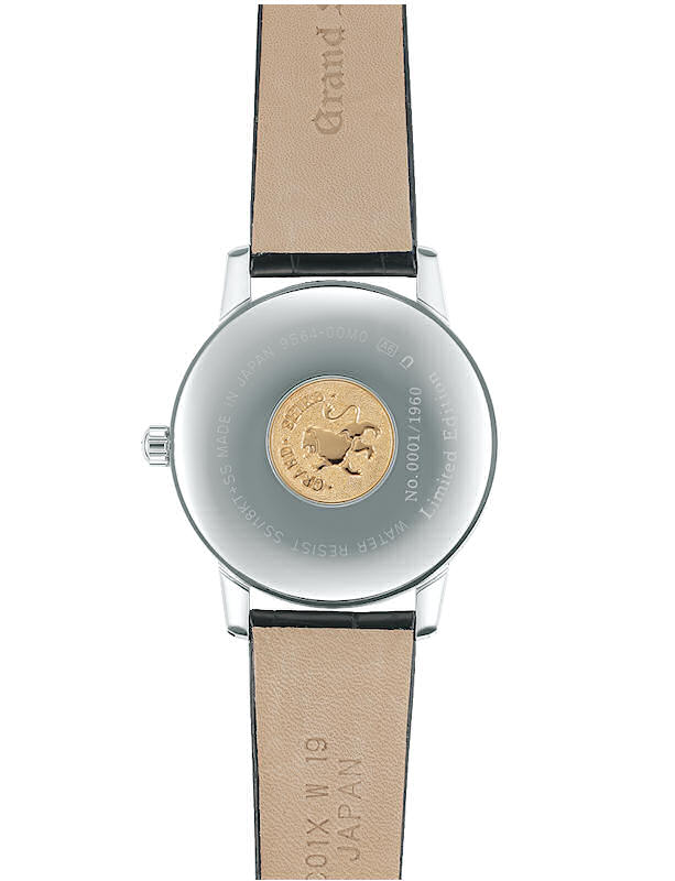 Grand Seiko watch model SBGW253. Seiko Hand winding movement Cal. 9S64. Steel case with black crocodile leather strap. Case back engraved with Grand Seiko lion made of embedded 18k gold plate. Limited Edition of 1960 pieces.