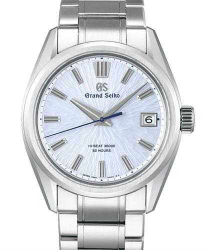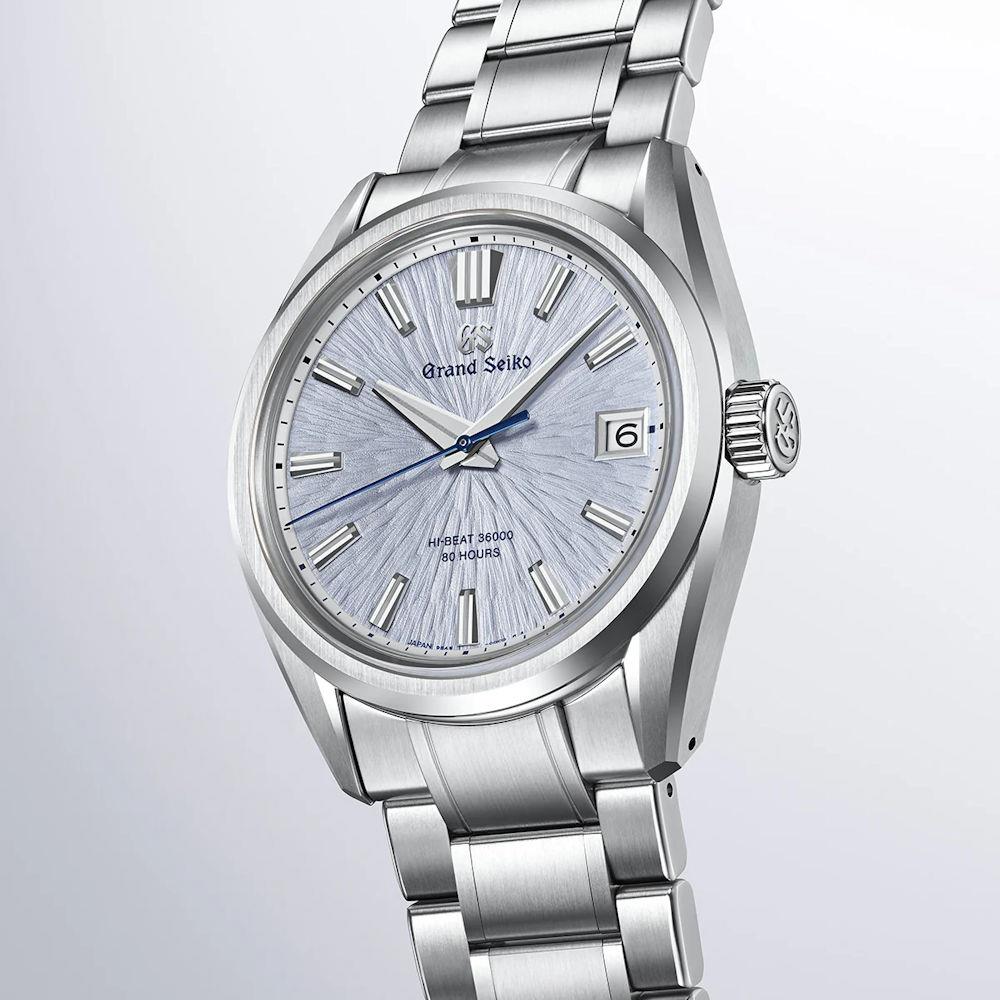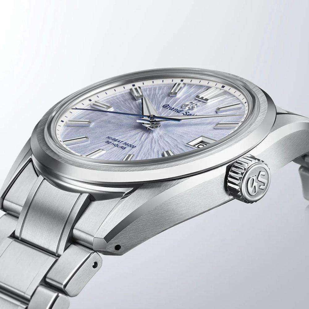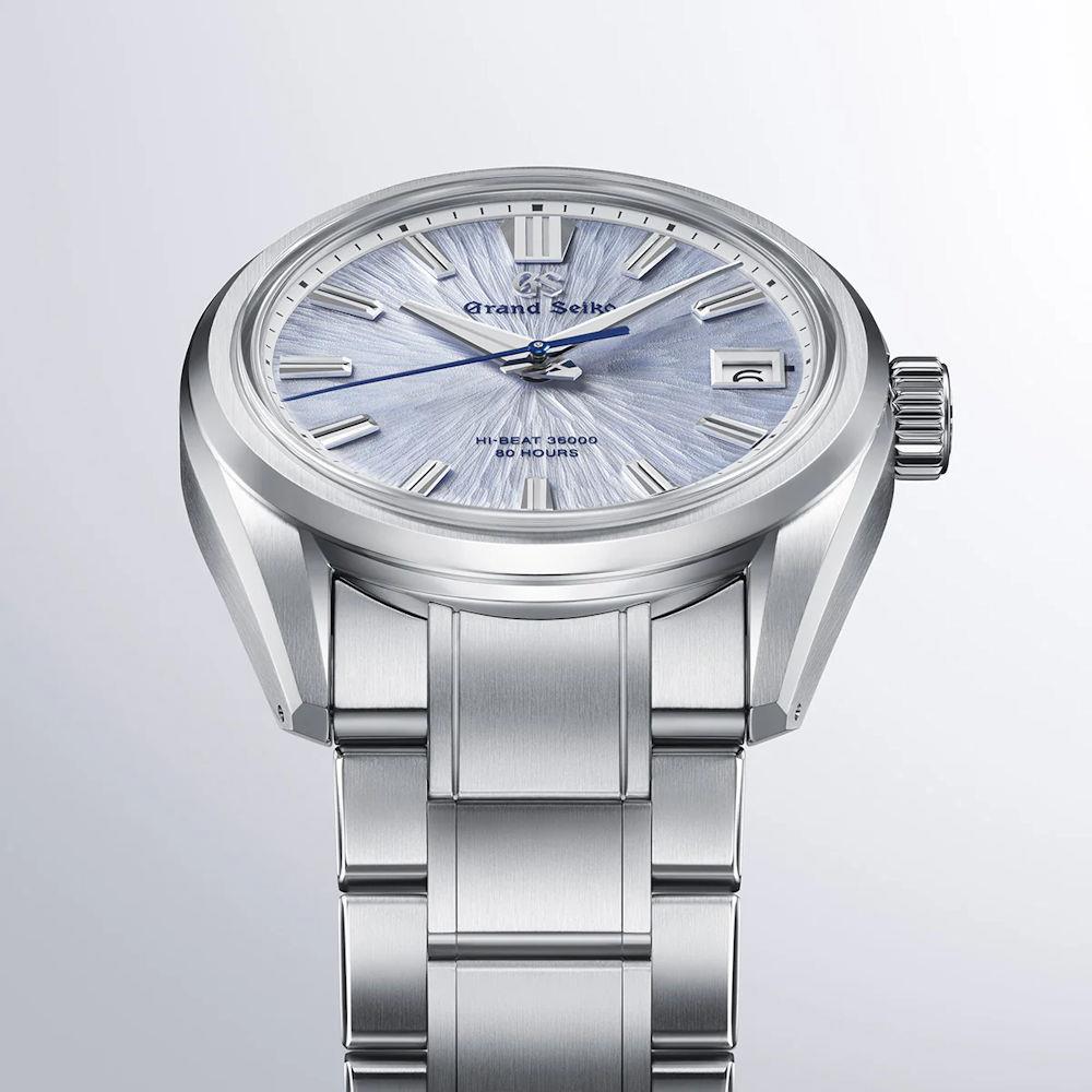Grand Seiko Evolution 9 Collection model SLGH027. Limited edition of 1200 pieces. The dial pattern represents the grandeur of the mountainscape of iconic Mt. Iwate from a fresh perspective, rendered in a serene light-blue hue that reflects the clarity of the surrounding air and water. Watch is powered by Grand Seiko Automatic Hi-Beat 36000 Caliber 9SA5 movement with hand winding capability. Ever-Brilliant stainless steel case with observation back and bracelet