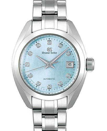 Grand Seiko Elegance ladies watch model STGK023. "Mizu hanada" blue dial with date calendar and diamond markers. Seiko automatic movement. All stainless steel case and bracelet. Sapphire crystal. Observation back.