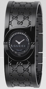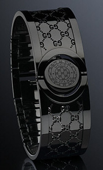 34 black diamonds on the bezel. Thin cuff style black stainless steel bracelet with "GG" engraved all over it. Swiss quartz movement. Black color dial.