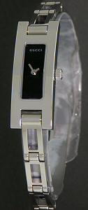Gucci 3900 Collection. Stainless steel curved rectangular case and watch bracelet with jewelry clasp. Black dial.