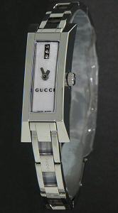 Gucci G-Link Collection. Stainless steel curved rectangular case and watch bracelet with jewelry clasp. White Mother-of-Pearl dial with 3 diamonds at 3 o`clock position.