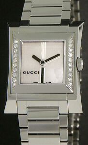 Gucci Guccio Line. Small size stainless steel case with 20 diamonds. White Mother-of-Pearl dial. Stainless steel watch bracelet with tri-fold clasp.