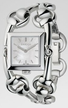 Gucci Signoria smaller 20mm size case. Horsebit style stainless steel bracelet. White Mother-of-Pearl dial. Swiss quartz movement. Polished stainless steel case with crown at 6 o`clock position.