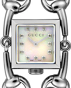 Gucci Signoria smaller 20mm size case. Horsebit style stainless steel bracelet. White Mother-of-Pearl dial with diamond markers. Swiss quartz movement. Polished stainless steel case with crown at 6 o`clock position.