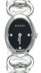 Gucci Tornabuoni quartz watch. Stainless steel polished oval shaped case. Horsebit bracelet. Black color dial with 3 diamond markers.