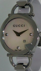 Gucci Chiodo quartz watch. Stainless steel polished round case. White Mother-of-Pearl dial with 3 diamond markers and date calendar. Steel bracelet.