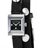 Gucci G-Frame quartz small watch. 14mm x 18mm stainless steel case with black double wrap leather strap with studs. Black dial.