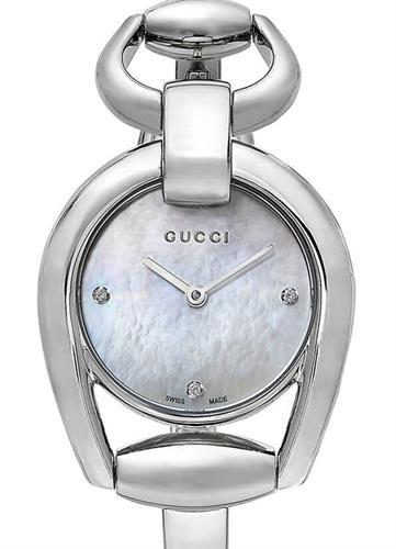 Gucci Horsebit Collection. Elegantly designed sleek 30mm case. Mother-of-Pearl dial with 3 diamond markers. Bangle style bracelet.