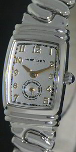 Hamilton Benton Lady wrist watch model H12411153 from Hamilton American Classic Collection. Swiss Quartz movement with small seconds sub-dial, highly polished steel case, silver color dial with gilt color Arabic numerals, stretch style watch bracelet