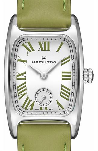 Hamilton Boulton model H13321813 from Hamilton American Classic Collection. Swiss quartz analog movement with small seconds platform. Polished stainless steel case. Curved sapphire crystal. White color dial with printed Roman numerals. Comes on a pistachio green color leather strap.