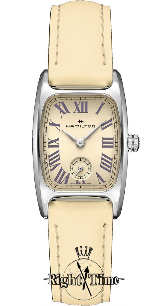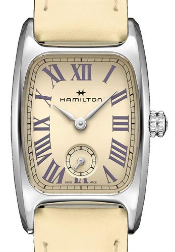 Hamilton Boulton model H13321821 from Hamilton American Classic Collection. Swiss quartz analog movement with small seconds platform. Polished stainless steel case. Curved sapphire crystal. Vanilla beige color dial with printed Roman numerals. Comes on a beige color leather strap.