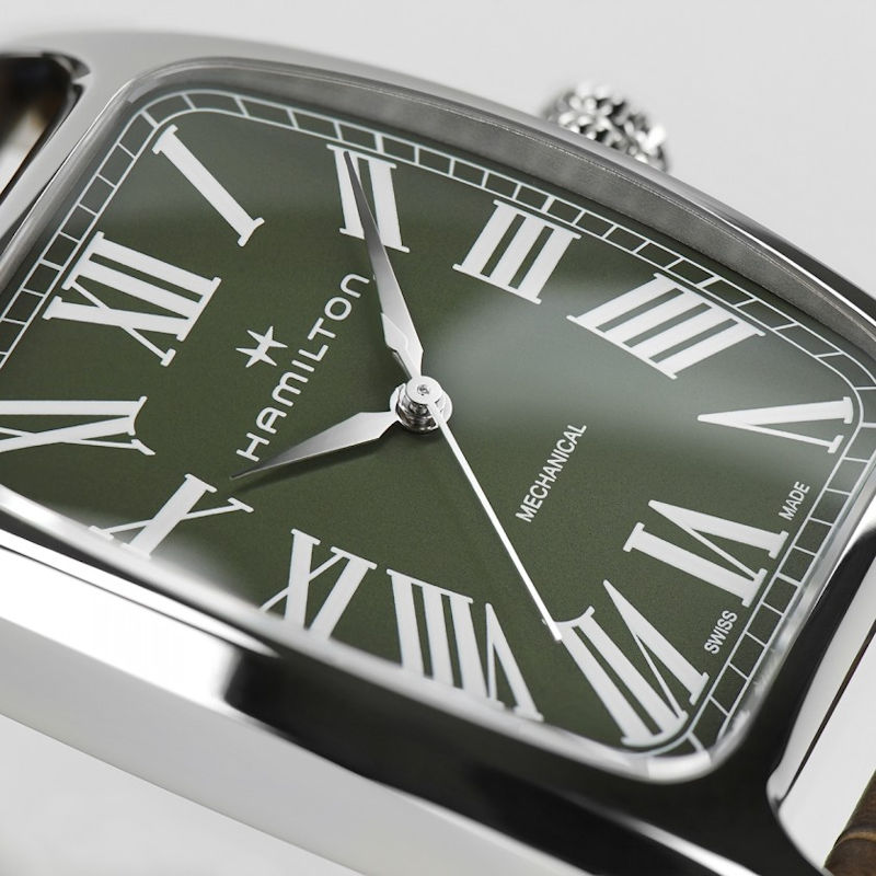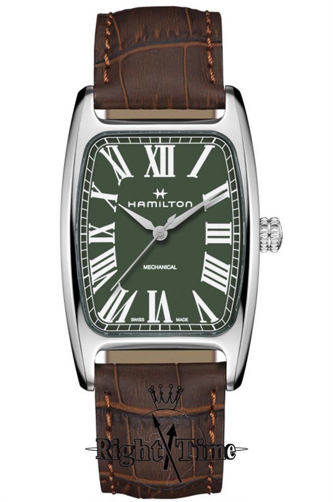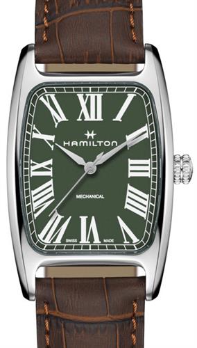 Hamilton Boulton model H13519561. Swiss made Hamilton H-50 manual wind movement. Stainless steel case. Green dial with roman numerals and steel tone hands. Brown leather strap with alligator grain pattern.