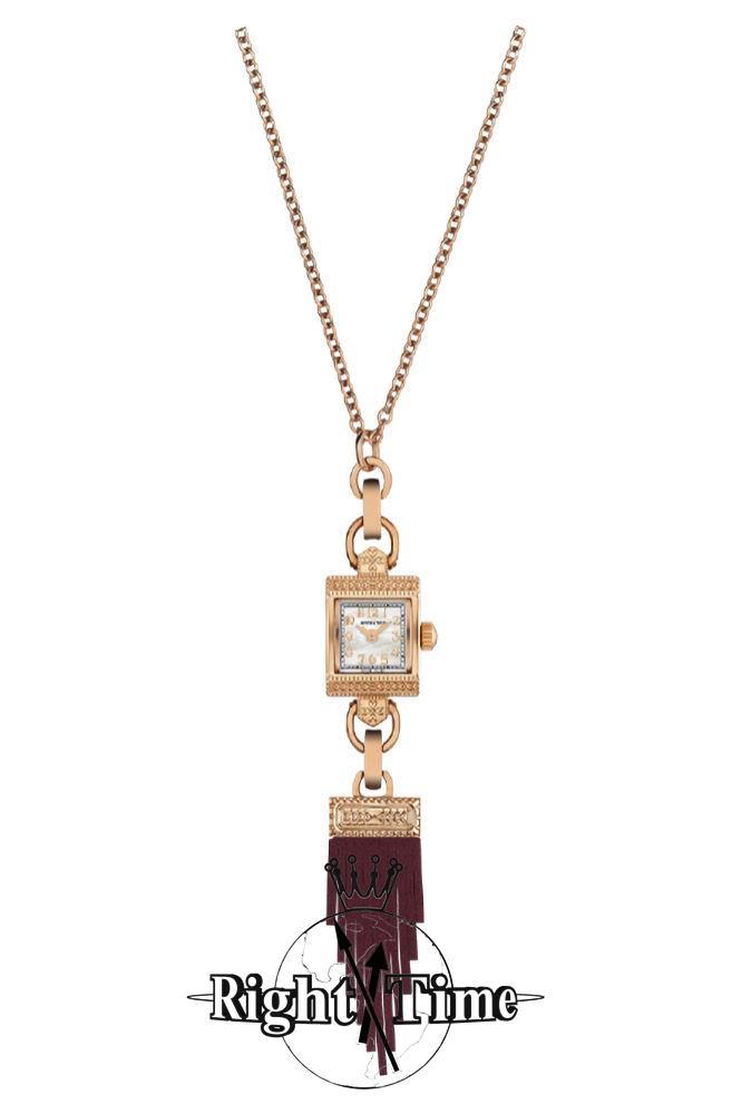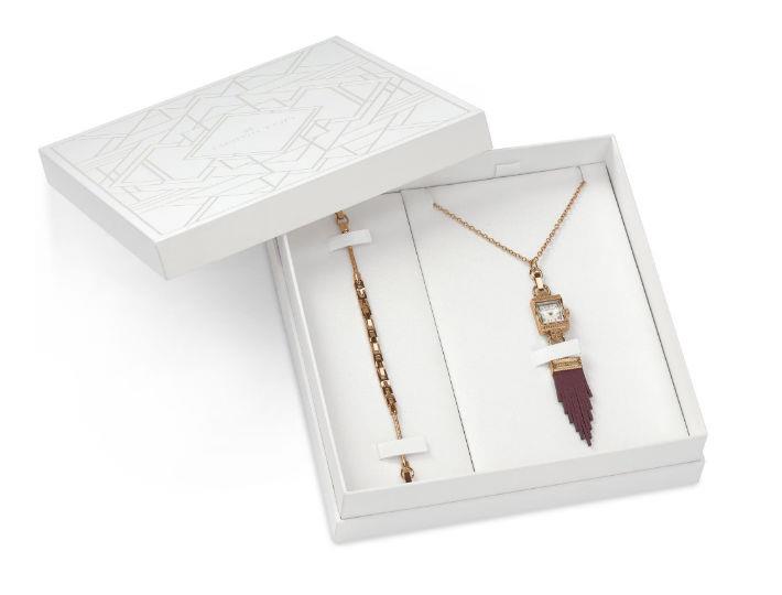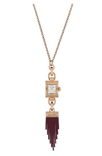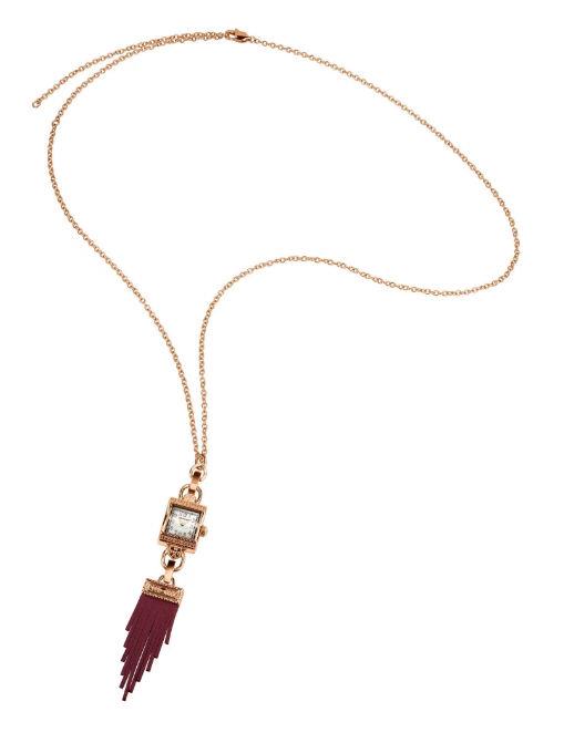 Lady Hamilton Necklace featuring a rose gold PVD coated stainless steel case with an intricate decor and a white dial. This watch pendant can be worn as a timepiece paired with a chain bracelet or as a part of a necklace with adjustable chain and a fringed tassel pendant in red burgundy.