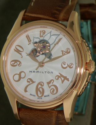 Lady "Jazzmaster" "Open Flower" automatic, rose gold plate case, silver guilloche dial with flower design cut out to view the balance wheel and partially opened back