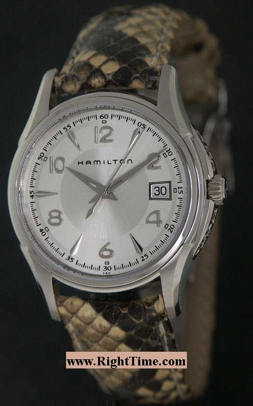 Hamilton Jazzmaster Lady wrist watch model H32391995 from Hamilton American Classic Collection. Swiss Quartz movement with date calendar, stainless steel case with rubies on the side, silver color dial with Arabic numerals, Python leather watch band.