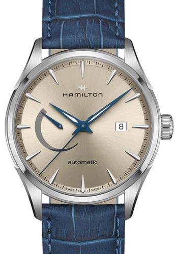 Hamilton Jazzmaster model H32635622. Solid stainless steel case with polished steel bezel. Silver tone dial with steel tone luminous markers and blued luminous hands. Hamilton H-13 automatic movement with 80-hour power reserve and date function. Sapphire crystal. Blue leather strap with alligator grain texture, and a deployment clasp.