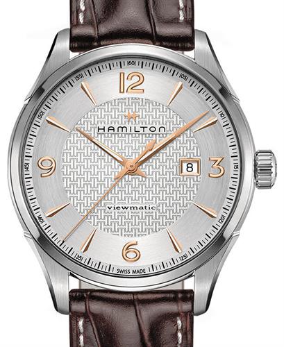 Hamilton Jazzmaster Viewmatic Auto watch model H32755551 from Hamilton American Classic Collection. Swiss Automatic ETA movement, large stainless steel case, sapphire crystal, silver color textured dial with rose gold tone markers, brown leather watch band.