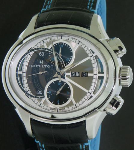 2016 Limited Edition. Unique and totally bizarre with a twist, American Classic Jazzmaster by Hamilton rolls out this limited edition of 1999 watches featuring reversing inner part of the case shell exposing chronograph face on one side and blue chronograph on the other side measuring Pusometer and Tachymeter with a simple flip. It is a large watch, but because it is an oval, lug to lug distance is 55mm and it sits well on an average size wrist