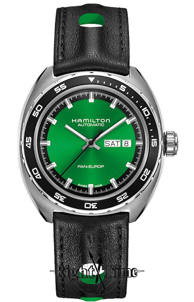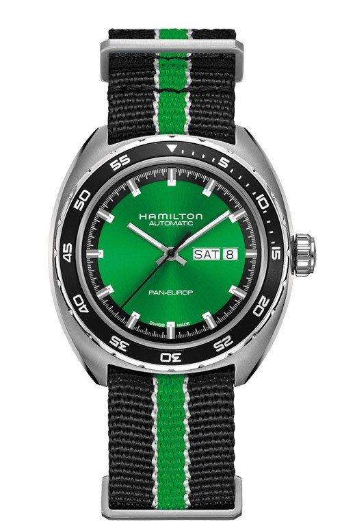 Hamilton Pan-Europ model H35415761. 42mm steel case with sapphire crystal, powered by automatic ETA movement with green dial, day/date calendar. Comes with both leather and Nato straps and a band remover tool