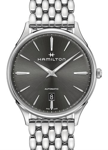 Hamilton Jazzmaster Thinline model H38525181. Swiss made ETA Automatic movement. High polish stainless steel case with bracelet. Black dial with steel hands and markers.
