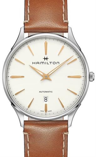 Hamilton Jazzmaster Thinline model H38525512. Highly polished stainless steel case. Silver dial with polished gold tone hands & markers. Swiss made ETA Automatic movement. Tan leather strap with cream color stitch and tang style buckle.