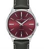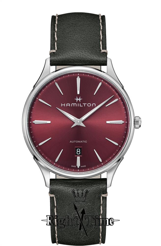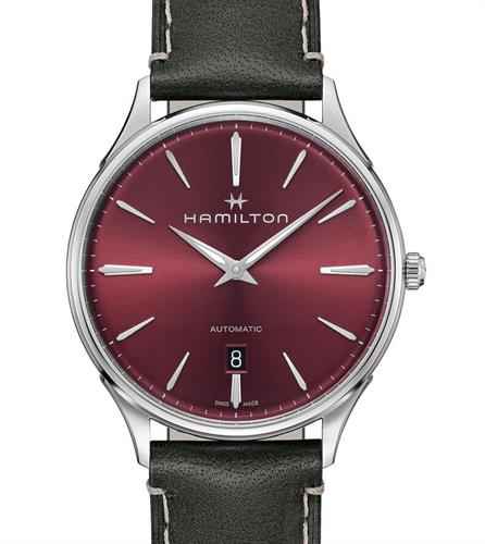 Hamilton Jazzmaster Thinline model H38525771. Swiss ETA 2892 automatic movement with date calendar. Solid stainless steel case in a 40mm diameter, but at only 8.45mm thick! Red dial with steel tone markers. Sapphire crystal. Black leather strap with white stitching.