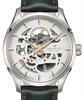 Hamilton Jazzmaster Skeleton model H42535810. Swiss made Hamilton H-10 automatic movement with 80 hour power reserve. Solid stainless steel case. Green leather strap with tang style buckle. White skeleton dial with gold tone hands and markers. Sapphire crystal. Water resistant to 5atm.