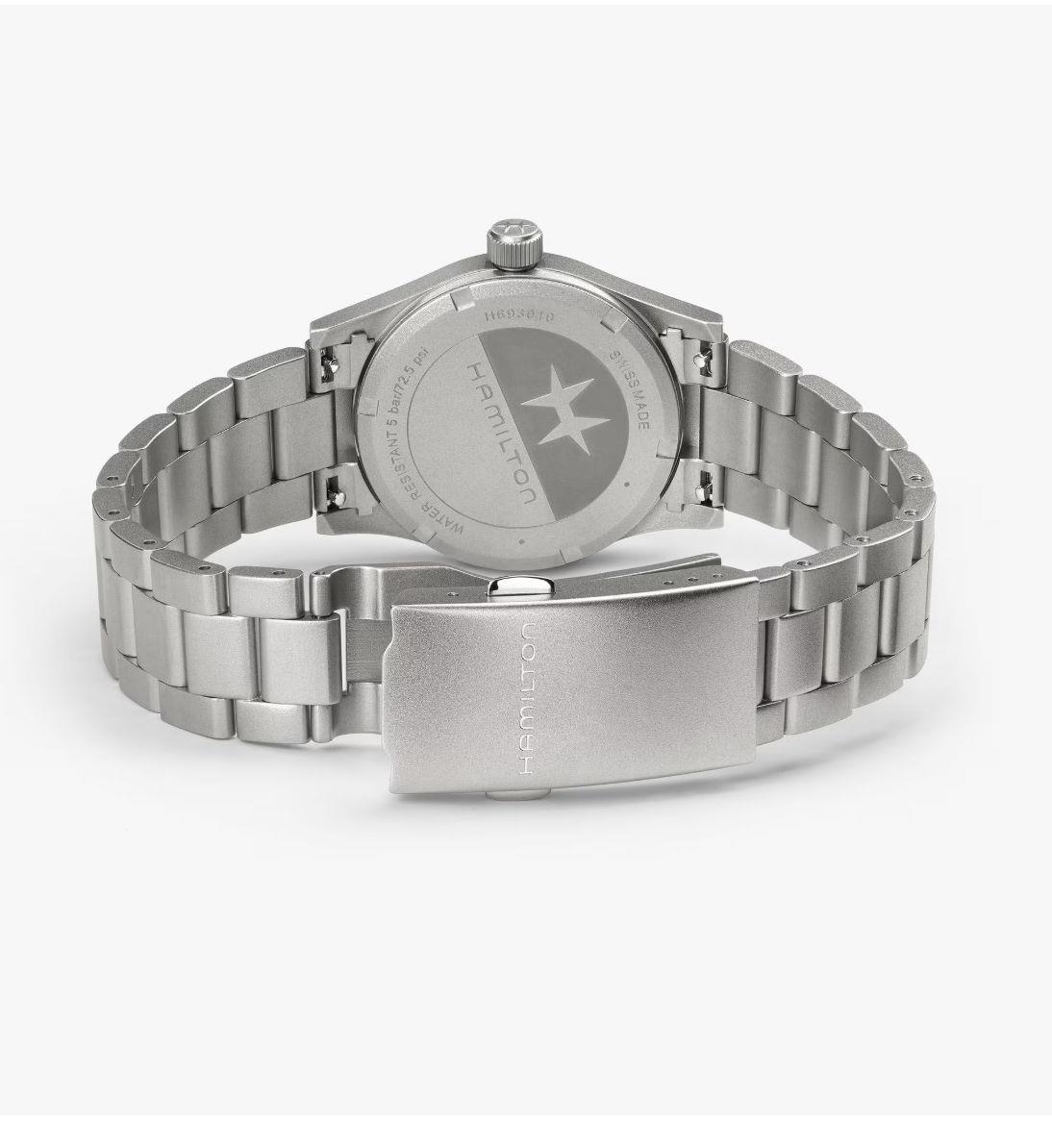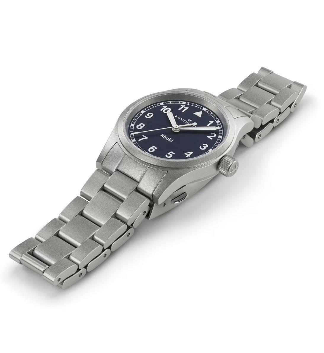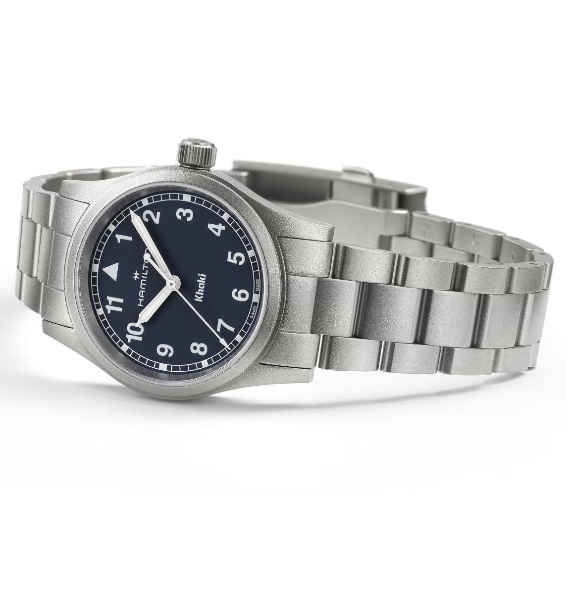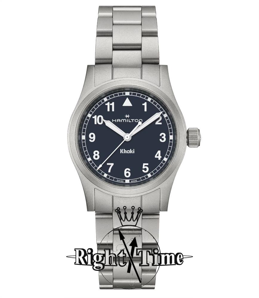 Hamilton Khaki Field Quartz model H69301140. Sandblasted 33mm stainless steel case and bracelet with a domed sapphire crystal. Blue dial with Arabic numerals and luminous hands/markers. Water resistant to 50 meters.