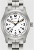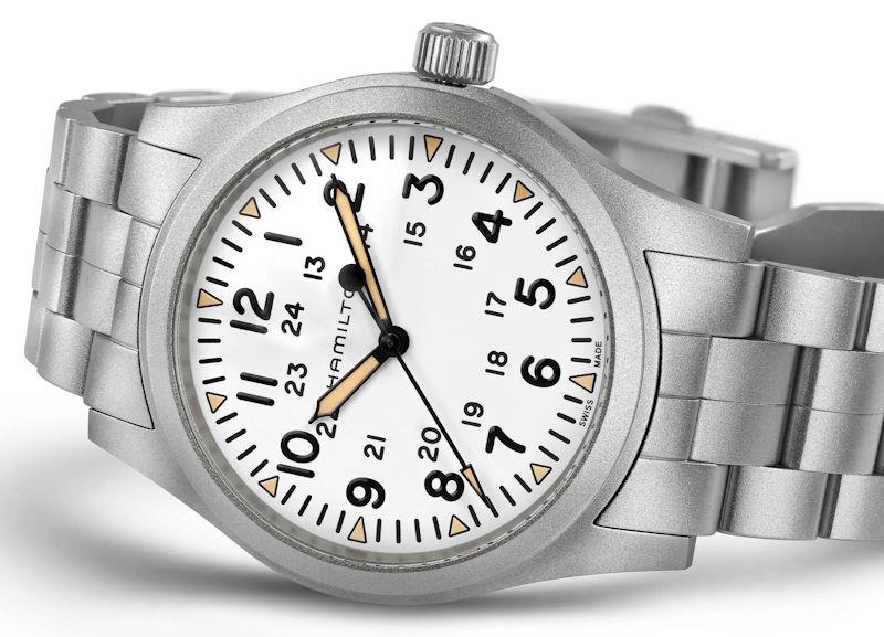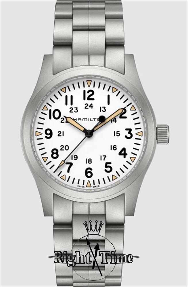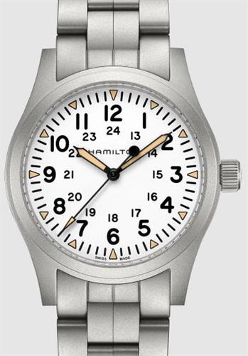 Hamilton Khaki Field model H69529113. Swiss made Hamilton H-50 manual-wind movement with 80 hour power reserve. Sandblasted 42mm stainless steel case and bracelet with a domed sapphire crystal. White dial with Arabic numerals and luminous hands/markers. Water resistant to 50meters.