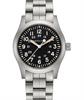Hamilton Khaki Field model H69529133. Swiss made Hamilton H-50 manual-wind movement with 80 hour power reserve. Sandblasted 42mm stainless steel case and bracelet with a domed sapphire crystal. Black dial with Arabic numerals and luminous hands/markers. Water resistant to 50meters.