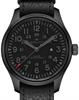 Hamilton Field Mechanical factory model H69809730. Large 50mm stainless steel case with Black PVD coating. Black-out style dial with raised Arabic numerals and Super-LumiNova on both numberals and hands. Swiss made Hamilton H-50 manual wind movement, with date function. Comes on a thin black leather NATO style strap with double prong PVD clasp. Limited edition of 550 worldwide.