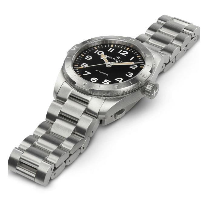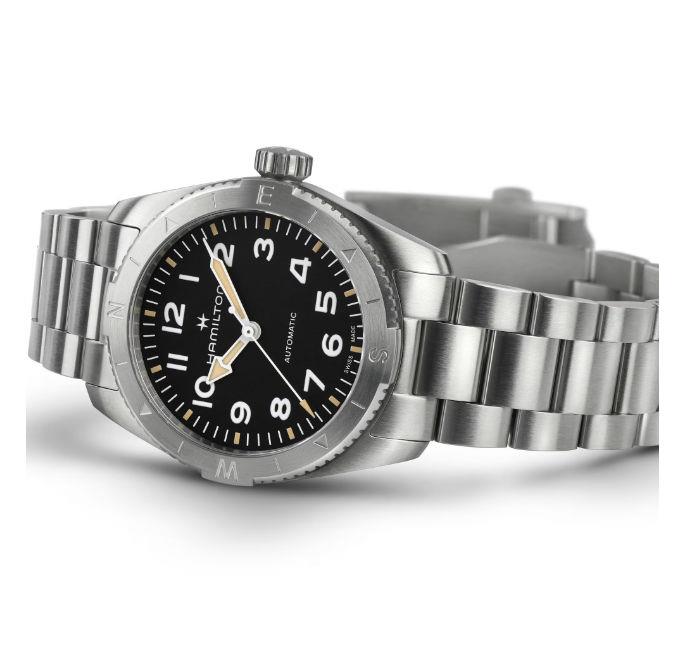 Hamilton Khaki Field model H70225130. Swiss made Hamilton calibre H-10 automatic movement with 80 hour power reserve. Black dial with luminous Arabic numerals. Stainless steel 37mm case with bracelet. Sapphire crystal.