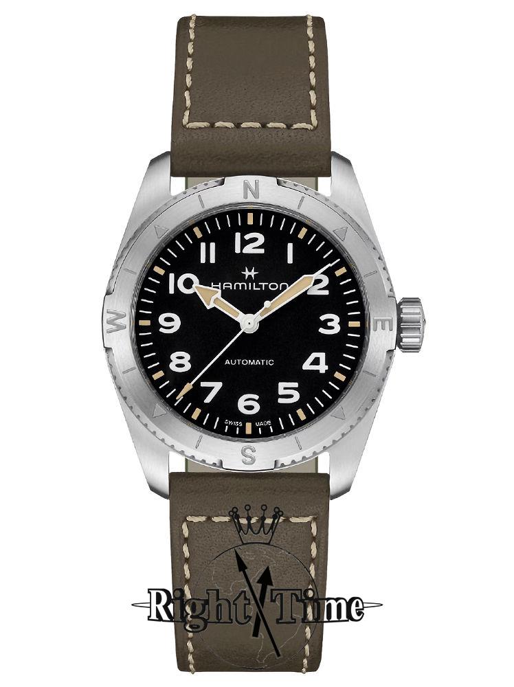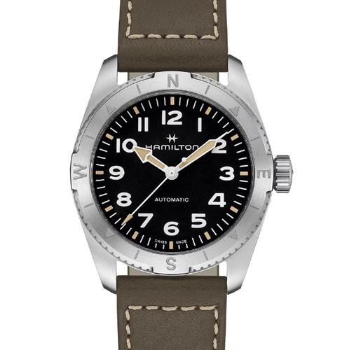 Hamilton Khaki Field model H70225540. Swiss made Hamilton calibre H-10 automatic movement with 80 hour power reserve. Black dial with Arabic numerals. Stainless steel 37mm case with brown leather strap. Sapphire crystal.