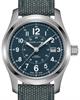 Hamilton Khaki Field, model H70305943. Stainless steel 40mm case. Powered by a self-winding Swiss made ETA automatic movement. Blue dial with Arabic numerals and date calendar display. Blue nylon/leather band.