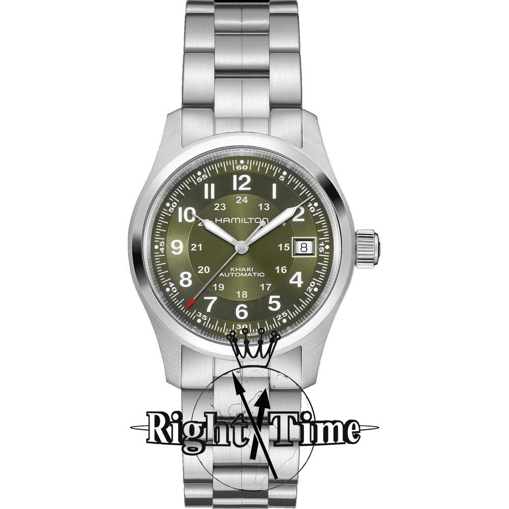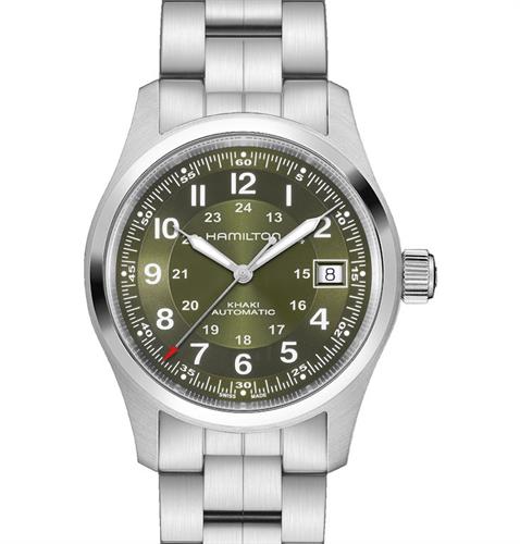 Hamilton Khaki Field model H70455160. Powered by the Hamilton H-10 automatic movement with up to 80 hour power reserve. Solid stainless steel case with bracelet. Slightly domed sapphire scratch resistant crystal. Green sunray dial with super luminova filled hands and markers. Water resistant to 100 meters.