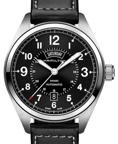 Hamilton Khaki Field Automatic wrist watch model H70505733 from Hamilton Khaki Collection. Self-winding mechanical Swiss ETA movement, day/date calendar, black vintage look dial with luminous hands and Arabic numerals, exhibition case back, black leather watch strap.