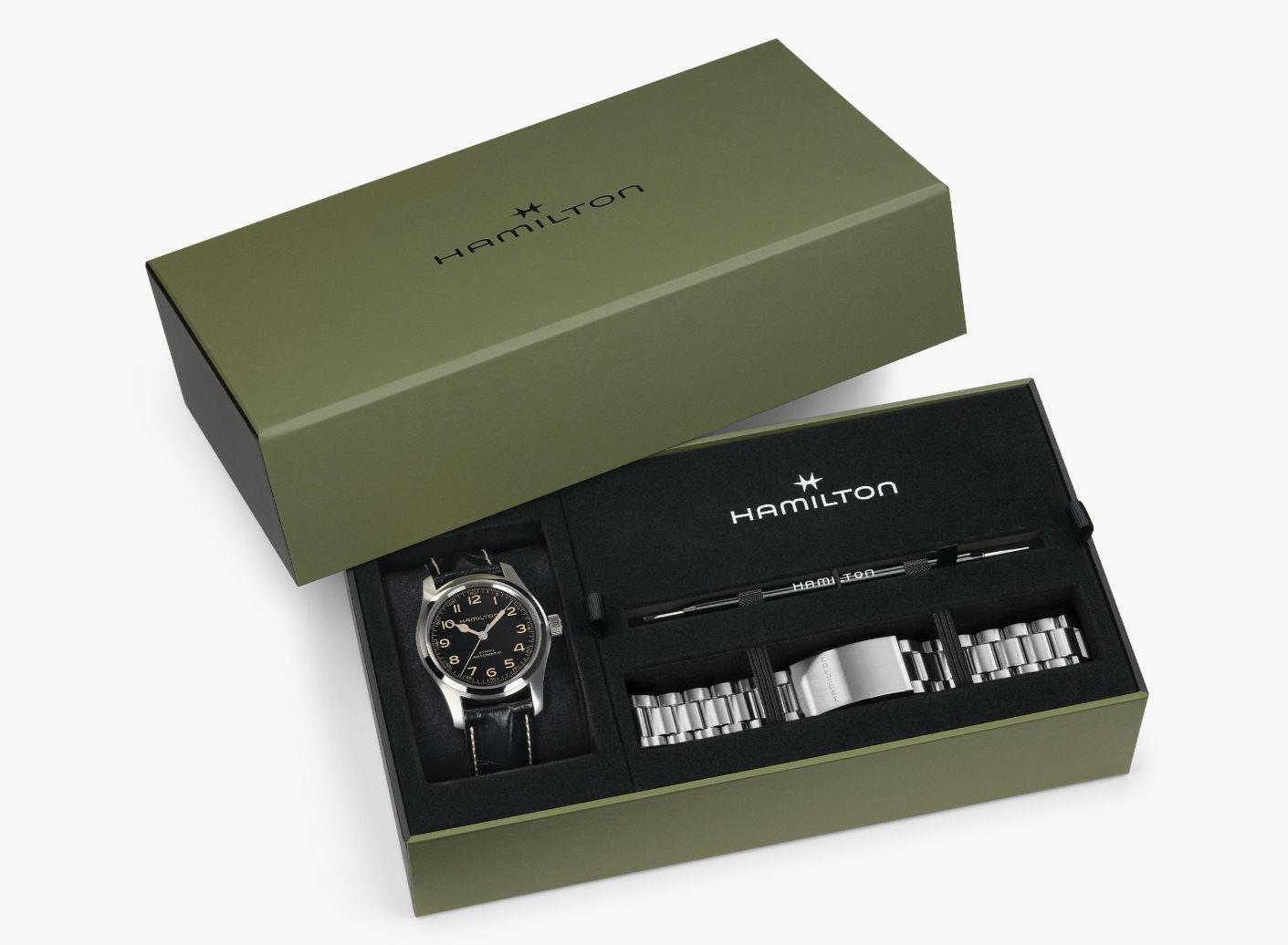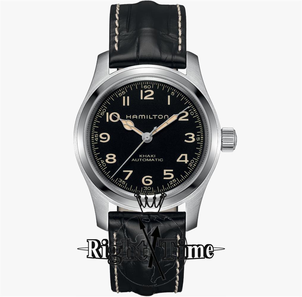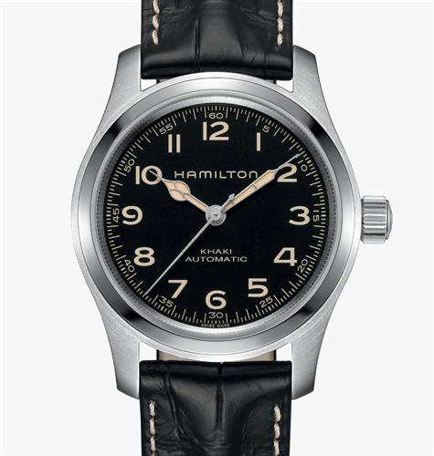 Hamilton Khaki Field model H70605732. Dubbed the "Murph" from the Christopher Nolan thriller Interstellar. Swiss made Hamilton H-10 automatic movement with 80 hour power reserve. Solid 42mm stainless steel case. Black dial with Arabic numerals. Black padded alligator grain strap with white stitch. Sapphire crystal. Comes in a set with metal bracelet and band replacing tool
