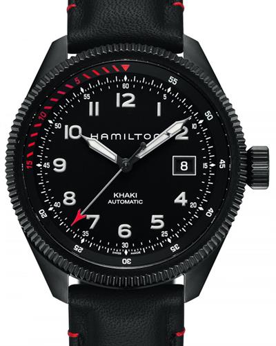 Hamilton H76695733 Khaki "Air Zermatt" edition. Released in homage to the famous Air Zermatt Swiss rescue teams. Air Zermatt is known for its daring and skillful mountain rescues over Europe and Asia. Uses the Hamilton ETA based H-10 movement. Black PVD coated stainless steel case. Black dial with inner rotating timer. Scratch resistant sapphire crystal. Black leather band with black PVD buckle.
