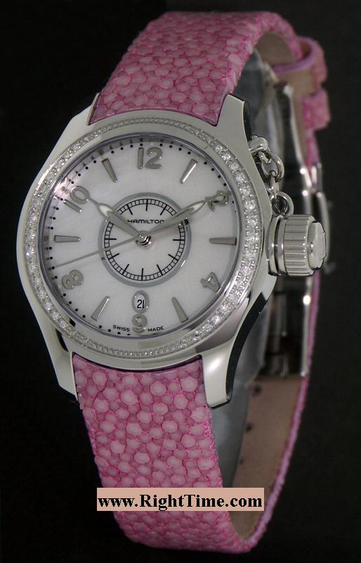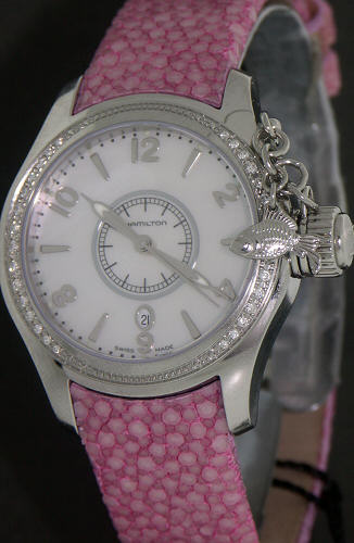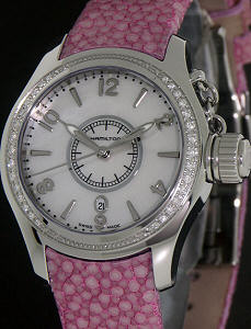 Hamilton Khaki Navy Seaqueen ladies watch with pink stingray leather watch strap. Polished stainless steel case with diamonds on the bezel. Quartz movement. White Mother-of-Pearl dial.